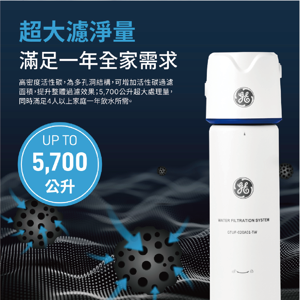 * 5,700公升超大處理量,滿足4人以上家庭一年飲水所需。