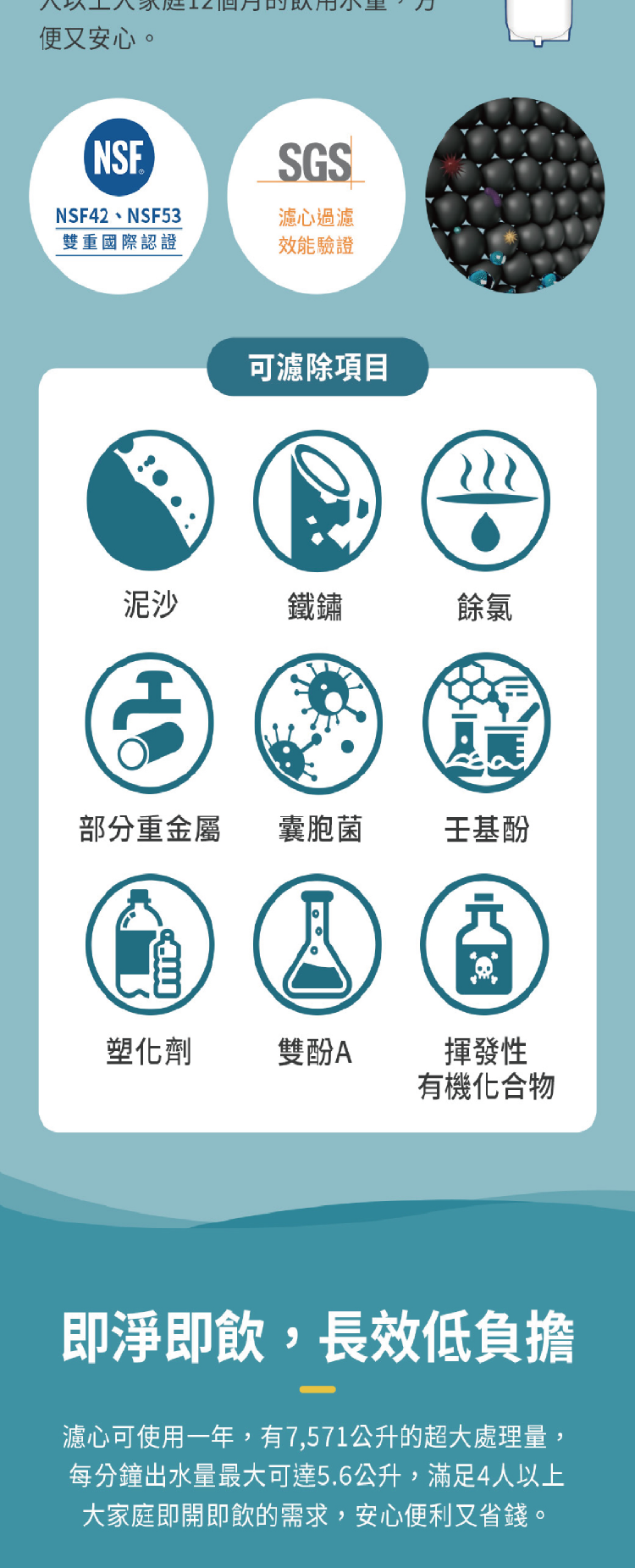 * 經SGS檢驗測試,可有效去除水中鉛及VOCs(揮發性有機化合物)