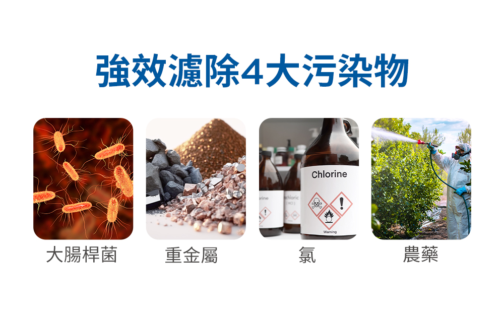 * 有效過濾影響口感與氣味之物質、氯氣、三鹵甲烷、農藥(CAT)、2-MIB(臭味有機化合物)等有機汙染物 飲水安心有保障!