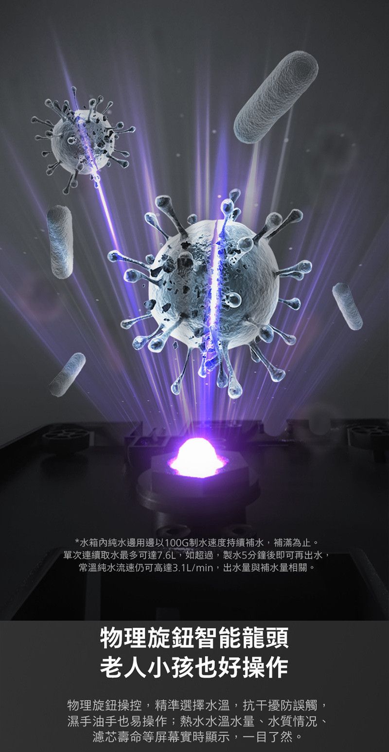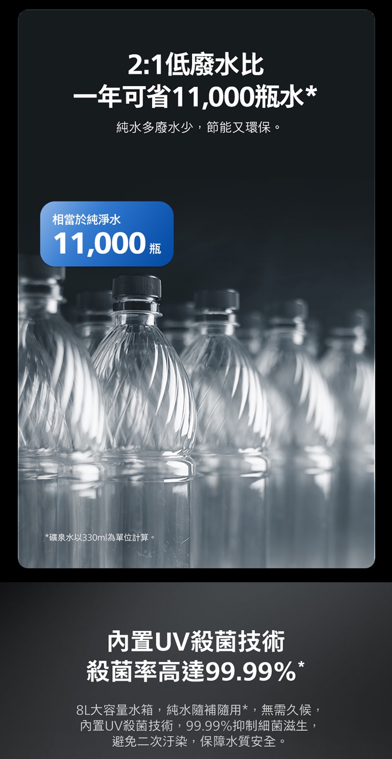 * 內置 UV 紫外線殺菌模組,殺菌率高達 99.99%,搭配 8L 大容量水箱,隨取隨用