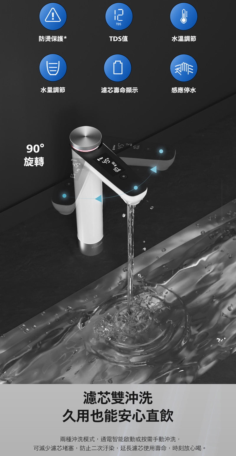 * 搭配螢幕實時顯示 水溫、水量、水質(TDS 值)、濾芯壽命等