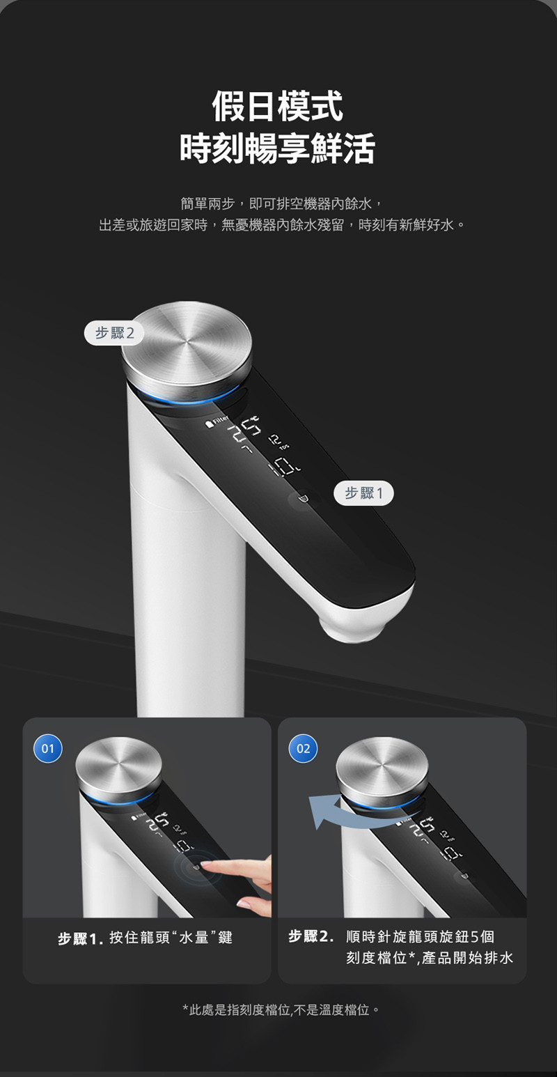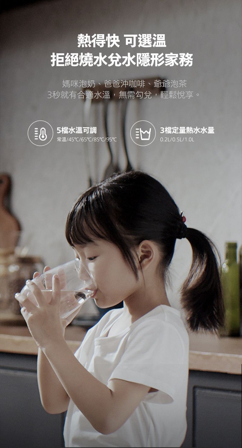 * 五段水溫(常溫/45°C/65°C/85°C/95°C)與三段定量出水(0.2L/0.5L/1.0L)自由切換