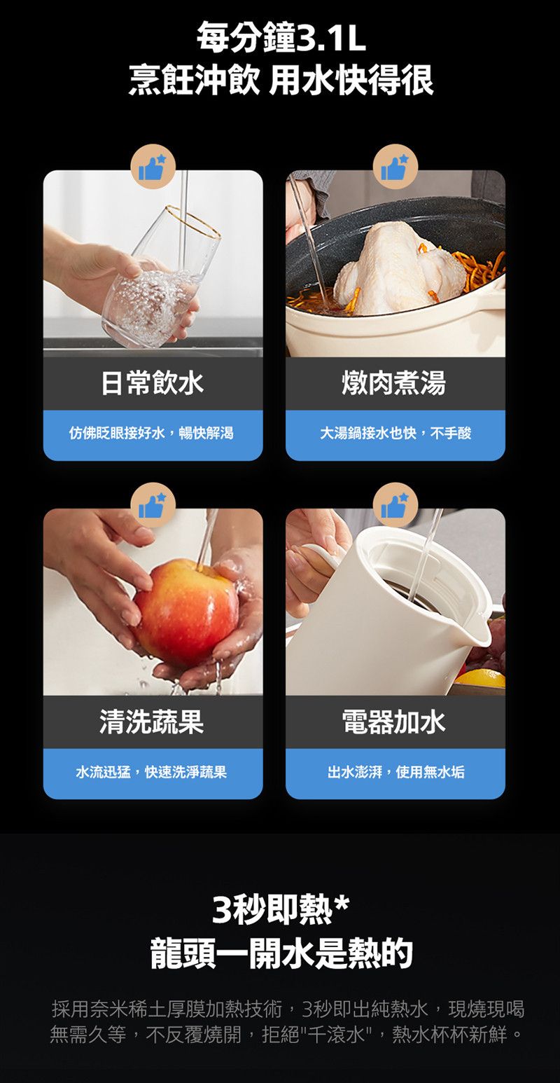 * 110V電壓,奈米瞬熱技術|3秒即出熱水