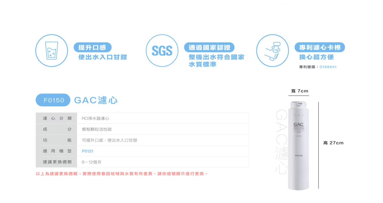 替換濾心|F0150 GAC濾心【櫻花SAKURA】【P0121標準型RO淨水器專用】