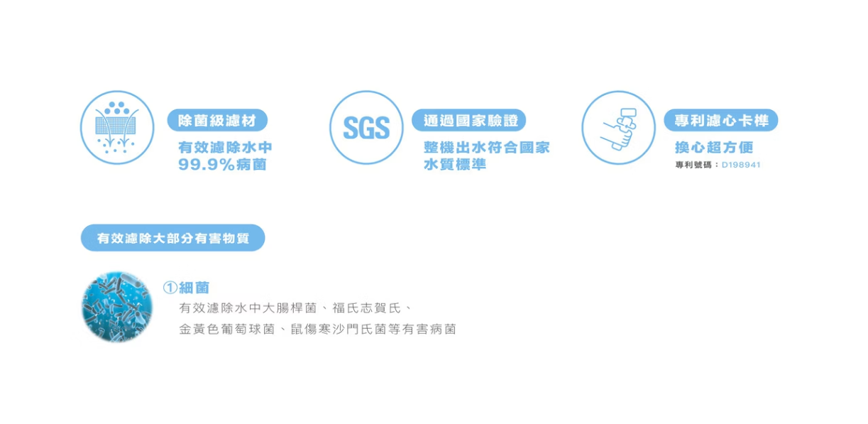 * 利用「靜電吸附」,可有效濾除水中大腸桿菌、金黃色葡萄球菌等有害病菌。