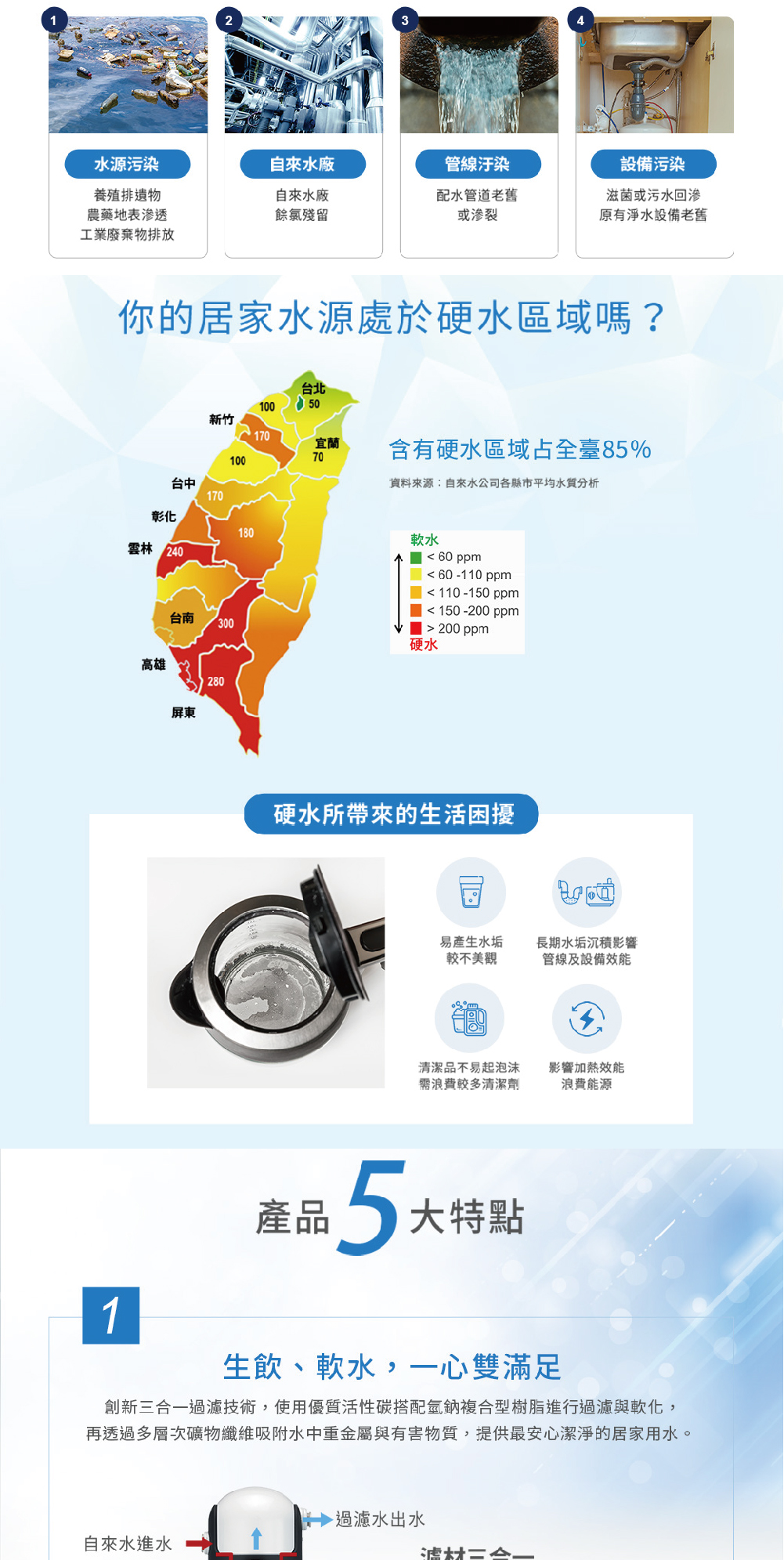 * 採用氫鈉複合型態之離子交換樹脂,符合健康概念