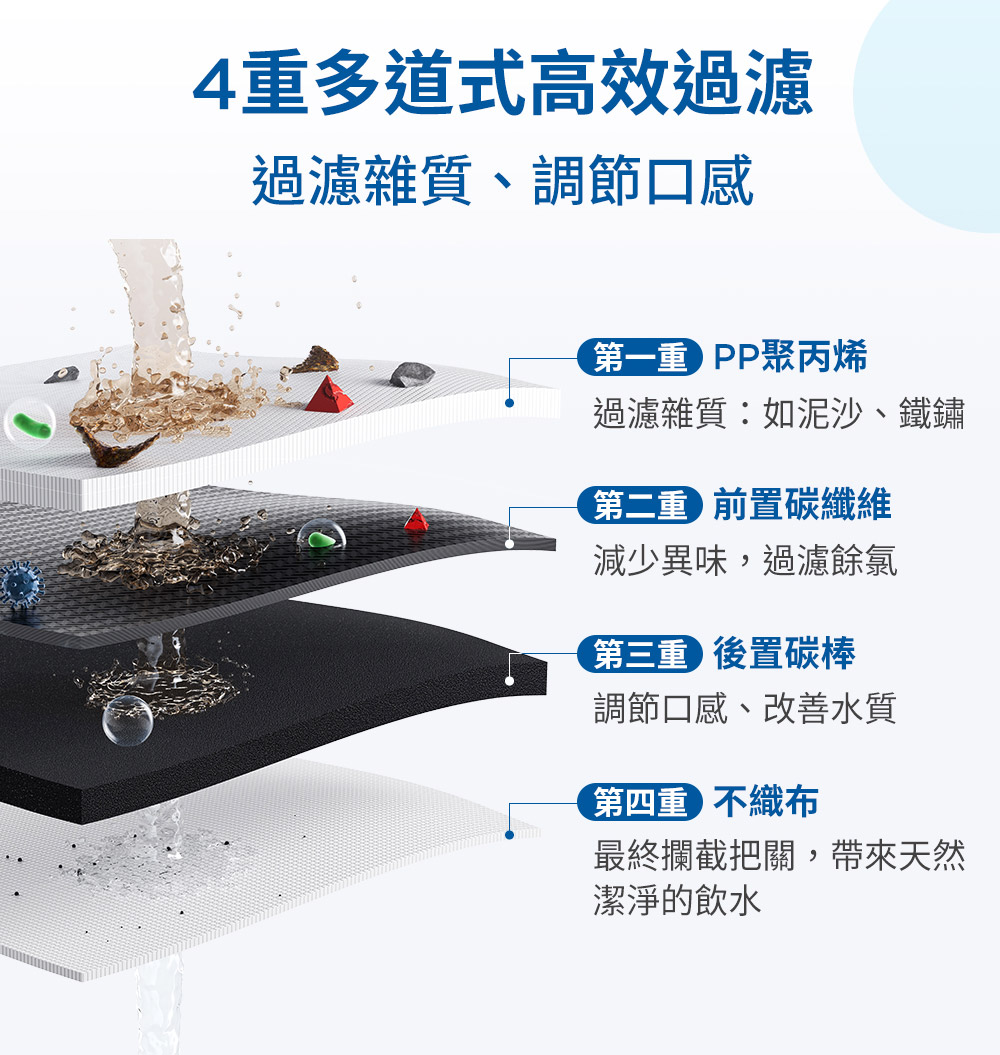 * 前置碳纖維:減少異味產生,可過濾水中多餘氯氣,改善飲用時的口感