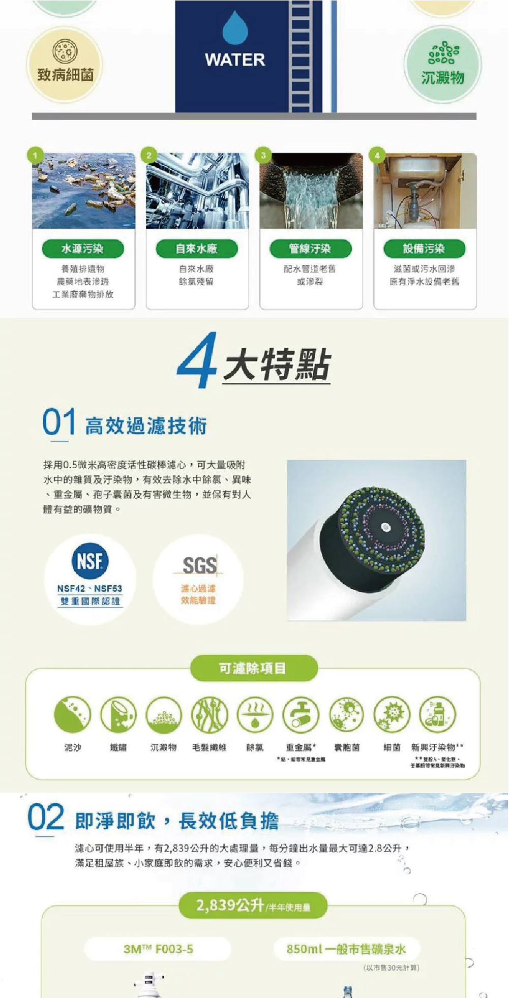 * 選用通過美國NSF認證(42.53)的高密度活性碳棒濾心,有效濾除餘氯及異味、沈積物、孢囊菌、重金屬鉛