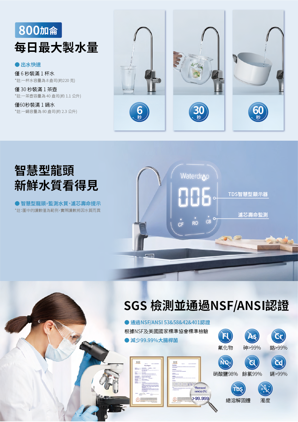 * 每日最大製水量800加侖,每分鐘2.6公升