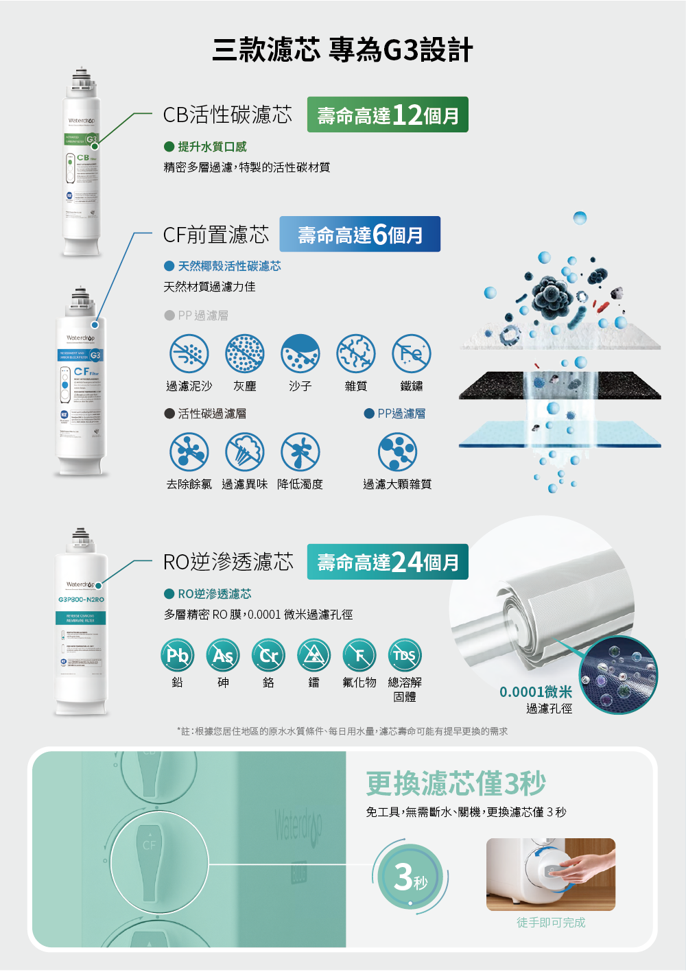 * 免工具,無須斷水、關機,更換濾芯僅3秒